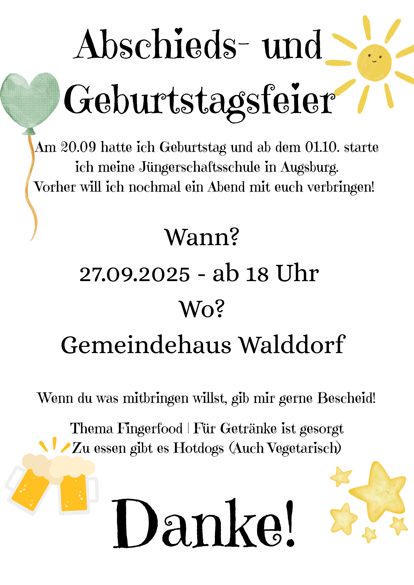 Normalerweise bin ich kein Mensch, der gerne meine Aktivitäten oder Geburtstage feiert, aber für diesen Abschied wollte ich unbedingt noch was Großes starten und allen Menschen „Auf Wiedersehen“ sagen, die ich in den letzten 10 Jahren in Walddorf und im letzten Jahr in Ebhausen kennen und lieben gelernt habe.